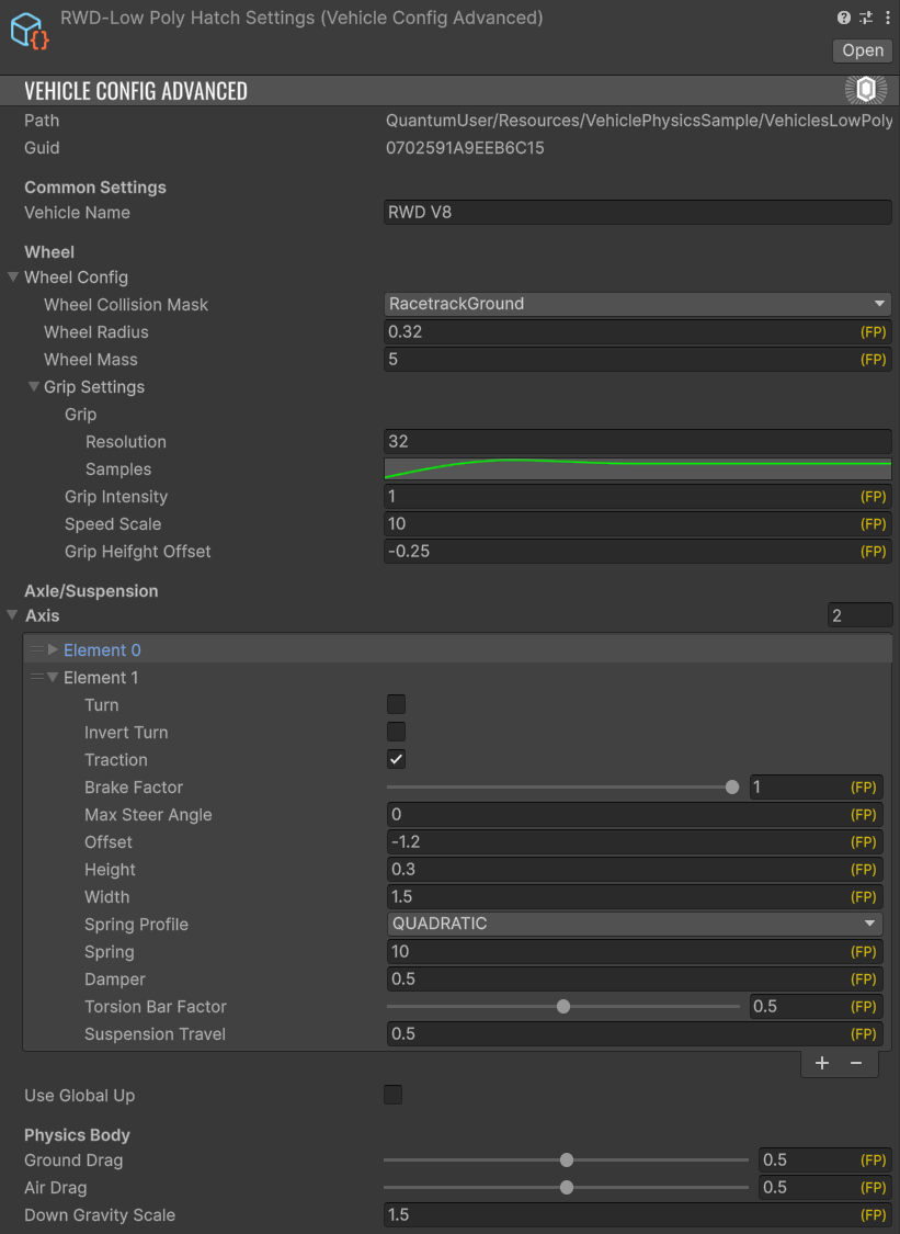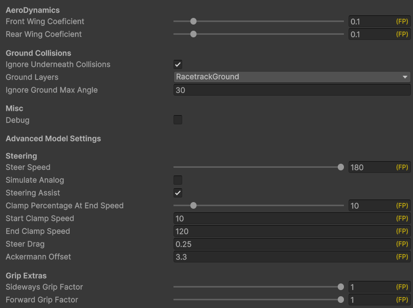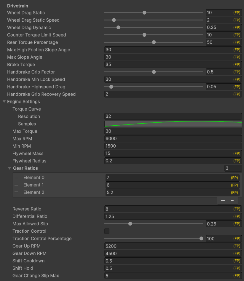 For those interested in game development, here is a screenshot of the Vehicle Settings I created for this, and each of these cars have their small variations of these: